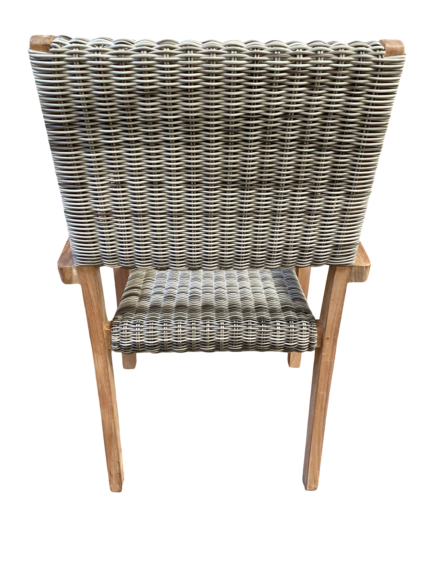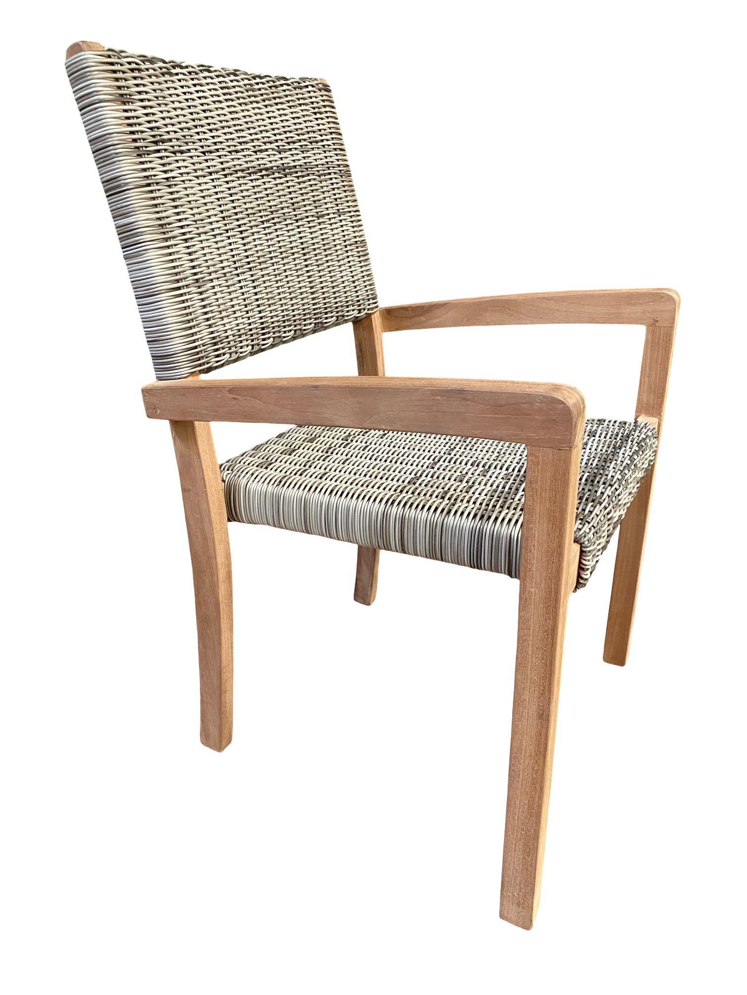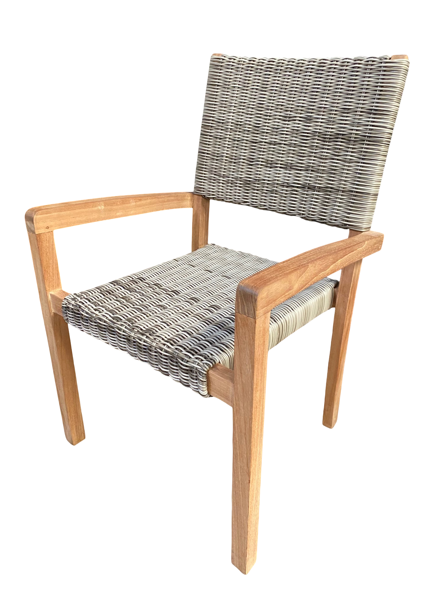 Pack 6 sillas con brazos “Bali” apilable de madera de Teca maciza con el asiento y respaldad de ratán sintética “Medan” con medidas 58 cm de ancho x 58 cm de fondo x 90 cm de alto, vienen montados y pegados de fabrica que le hace mucho mas resistente.