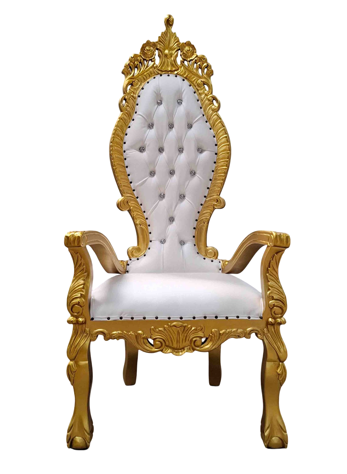 Sillón/trono XXL en oro con tela piel sintética blanca y botones de cristales en su respaldad, hecho y tallado a mano de madera de caoba con medidas 90cm de ancho x 75cm de fondo x 180cm de alto, perfectos para reyes magos, papa Noel o otros eventos.