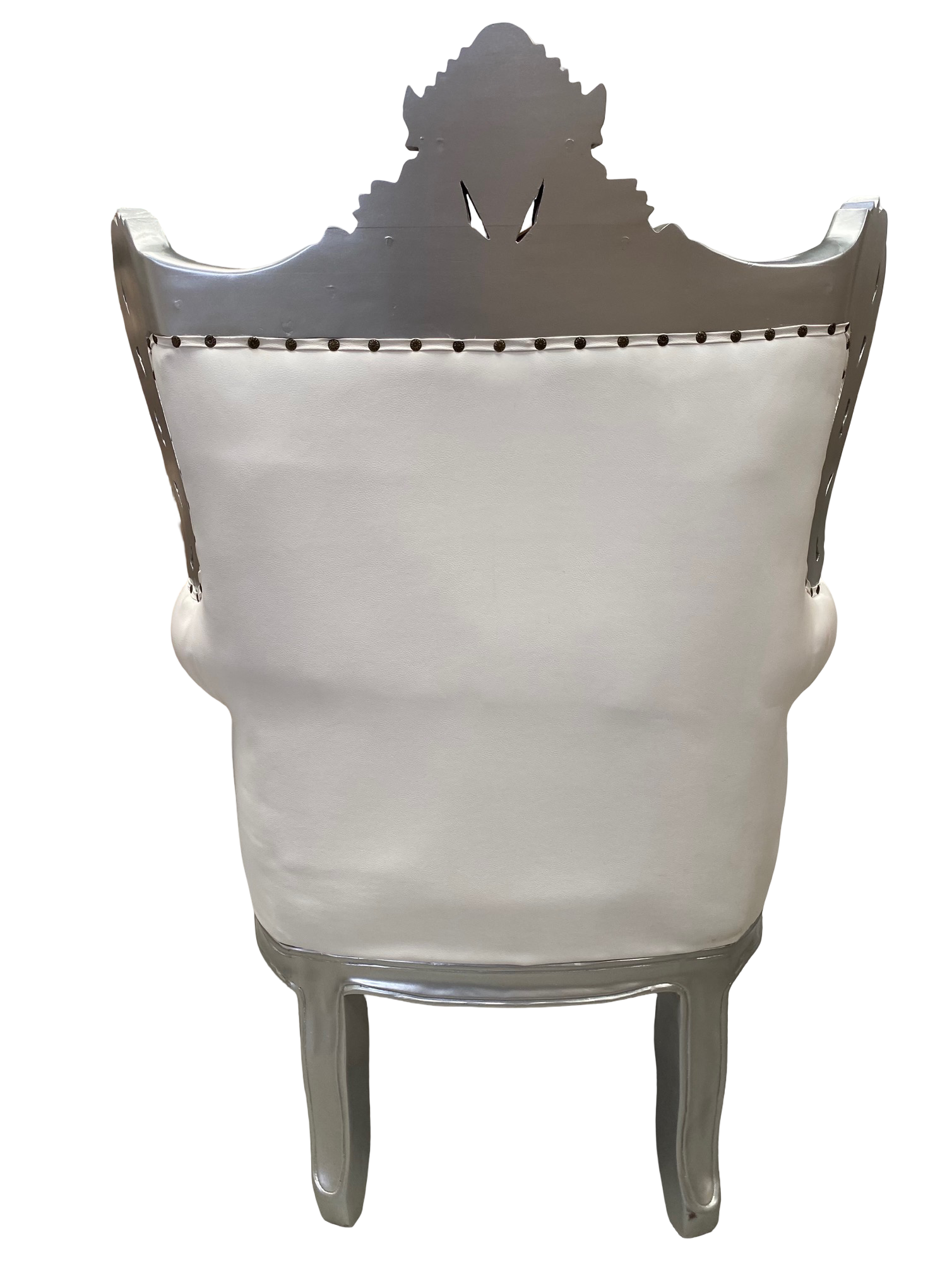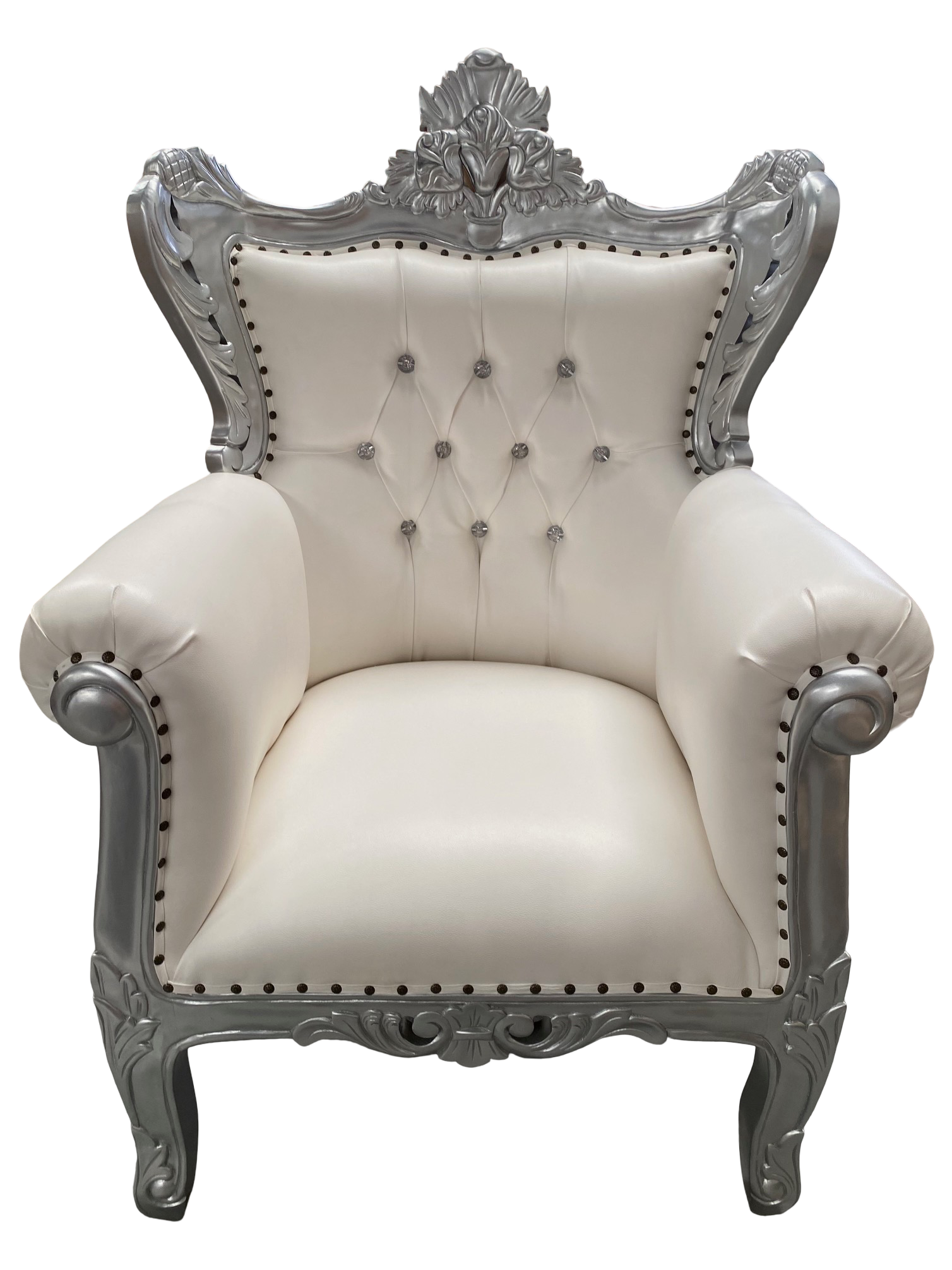 Trono/butaca en plata con piel sintética blanca y cristales en su respaldad, hecho y tallado a mano de madera de Caoba con medidas 85cm de ancho x 80cm de fondo x 130cm de alto. Perfectos para Papa Noel, eventos o reyes magos!